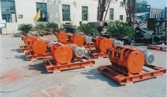 以上這些部件分別裝在殼體內外,殼體是一個具有較好鋼性的部件,有良好的支護作用并承受全部載荷。它用螺栓固定在與基礎相連的二根滑道上。雙筒絞車有一個主卷筒(裝在右側,即靠近電動機的一側),一個副卷筒(裝在左側)。 三筒絞車有一個主卷筒(裝在中間),二個副卷筒(裝在左邊和右邊),三筒絞車也可以裝二個主卷筒(裝在右側和中間),一個副卷筒(裝在左側),每一個卷筒都相應有一個操縱裝置和一個鋼繩導向裝置。