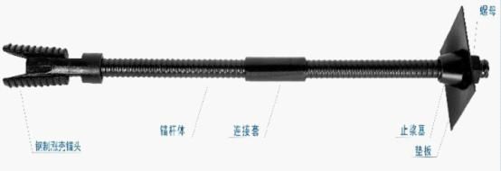 由鋼制漲殼錨頭、中空注漿錨桿體、止漿塞、墊板、螺母和連接套組成。