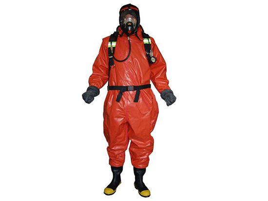氣密重型防化服,雙面Hypalon?涂層面料(550g/m2),組件和接縫采用內(nèi)/外部雙硫化密封,帶有高氣密性密封拉鏈,高強度、抗沖擊、高清晰度面屏,頭部后面配置雙排氣閥門。防護時間:防較強滲透性溶劑(甲苯等)、強酸堿(96%硫酸等)或強穿透性毒劑(芥子氣等)的時間≥2小時,防化靴防毒時間≥5小時,抗多種高濃度化學(xué)試劑滲透長達8小時以上,卓越的防酸堿性能,防火阻燃,耐UV/臭氧、抗曲饒龜裂、耐磨、防霧、防固體顆粒,浸水2小時以上不滲水,拉伸強度:徑向、緯向≥20KN/m。在-40℃~35℃范圍內(nèi)可正常使用,保證穿著者的舒適及安全。